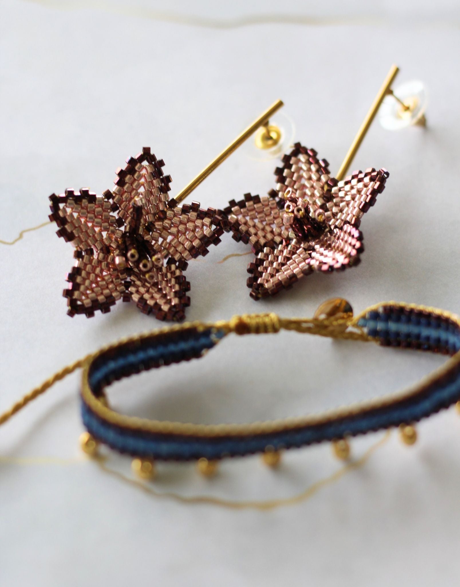Set de aretes de flores tridimensionales y pulsera elaboradas en miyuki. Piezas únicas.