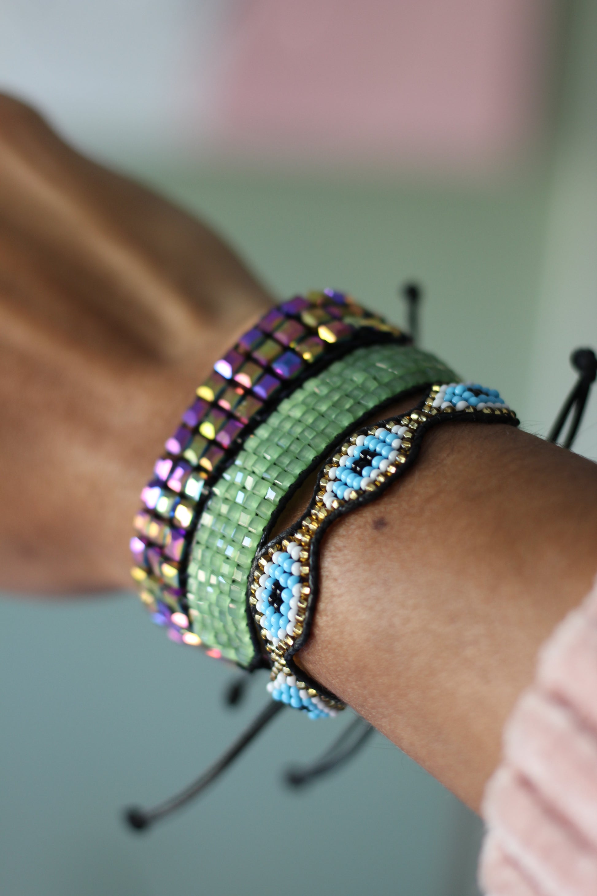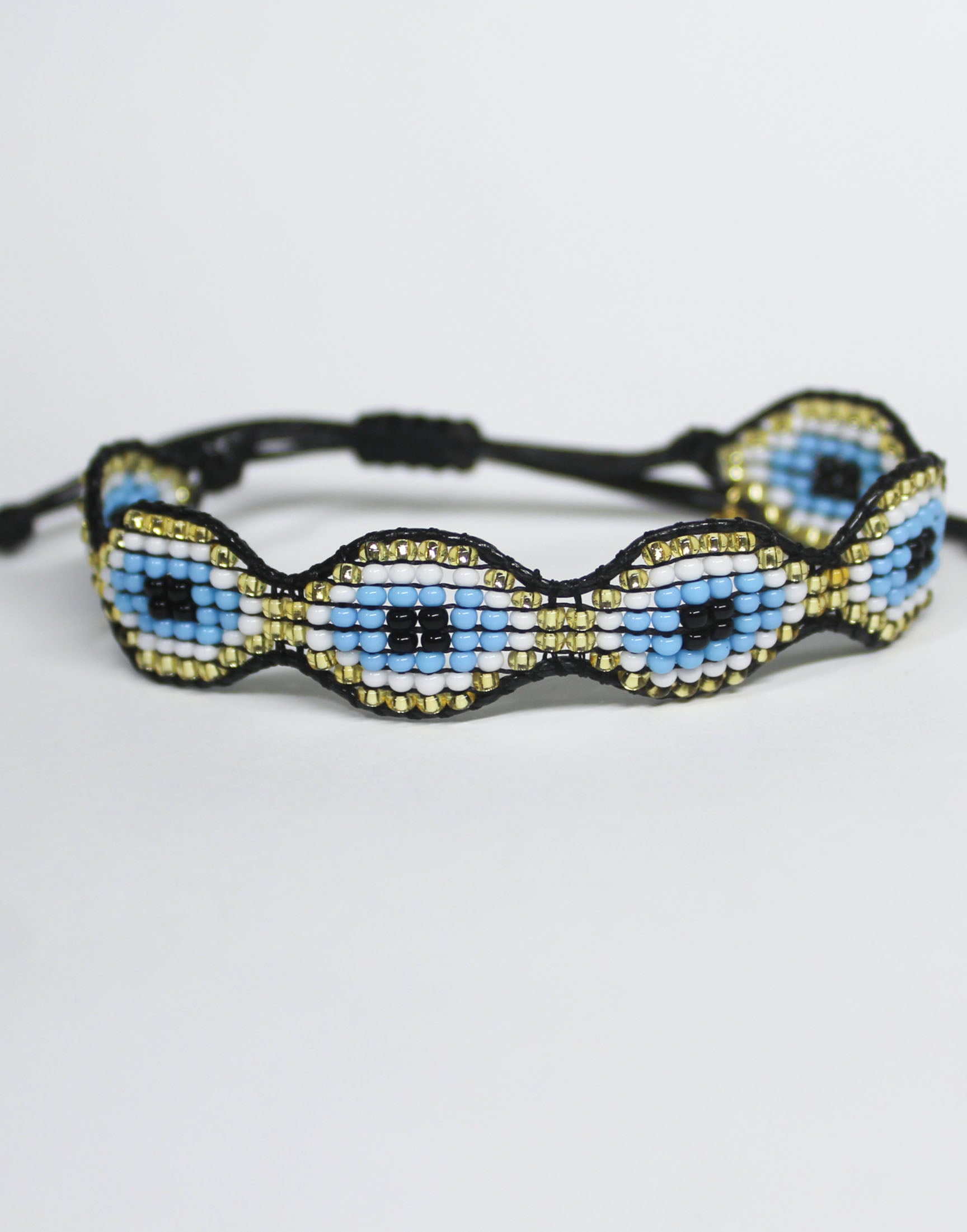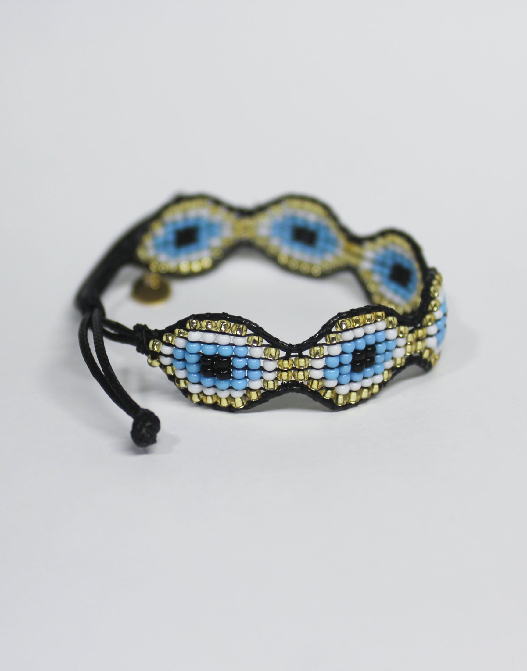 Pulsera en mostacilla con ojitos dorados.